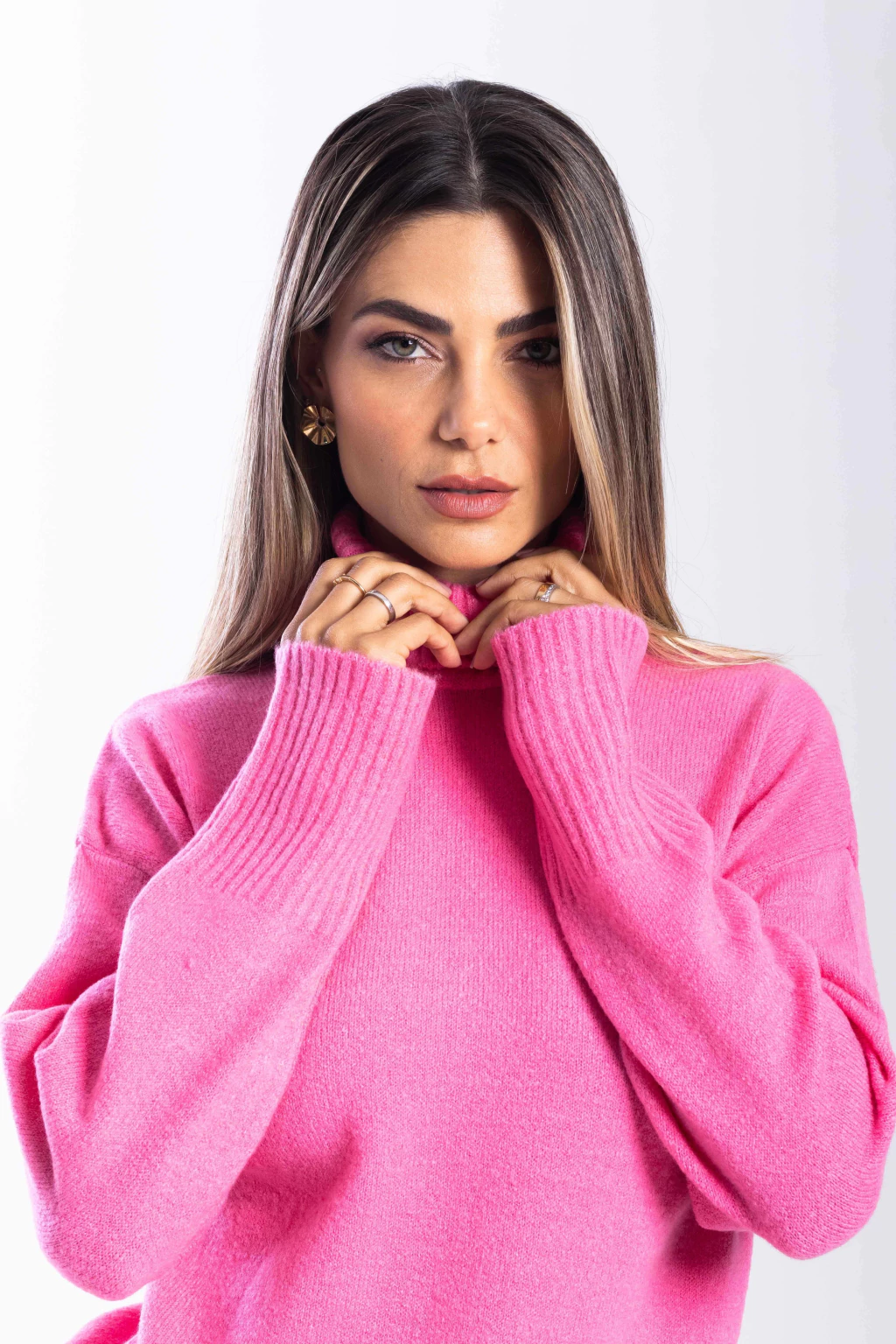 Apresentamos nossa blusa de tricô macio com gola alta Begônia, uma peça que combina conforto e elegância em um design moderno. Com detalhe canelado nos punhos, na barra e na gola, esta blusa possui uma modelagem ampla que proporciona liberdade de movimento e um caimento perfeito. Confeccionada com uma mistura de 72% acrílico, 25% poliamida e 3% Spandex, ela é ideal para quem busca um toque suave e aconchegante.
